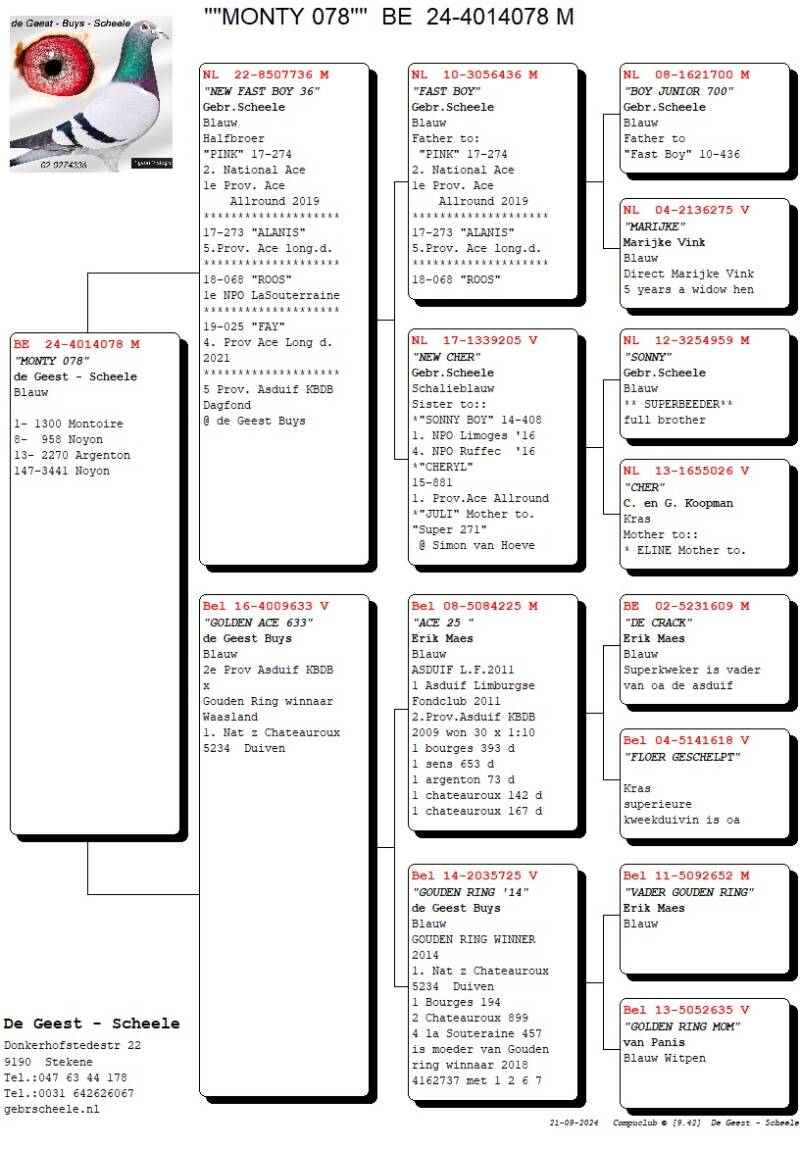 Jean-Pierre,Frans en Marleen de Geest winnen 1e Montoire met MONTY 078 tegen 1300 duiven. Kleinzoon FASTBOY X NEW CHER. ACE 25 X GOUDEN RING.